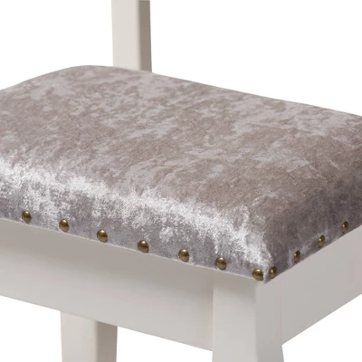 Establish an elegant space for your makeup routine with the Veronique vanity table and ottoman. This charming vanity features a large tabletop and three drawers with space to store cosmetics, perfume, and more. Inspired by French provincial furniture, the Veronique showcases cabriole legs and an intricately carved mirror frame. The vanity is accompanied by a matching ottoman upholstered in velvet and padded with foam for the utmost comfort as you get ready for the day ahead. Constructed from solid MDF wood, the Veronique set will be a fixture in your bedroom for years to come. The Veronique vanity table and ottoman are made in China and require assembly. Dimensions: 38.8″ High x 17.1″ Wide x 19.7″ Deep; Seating Dimensions: 30.1″ High (from Floor) x 17.1″ Wide x 15″ Deep; Back: 8.7″ High; Legs: 28.4″ High