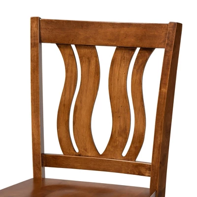 Furnish your dining room with the sleek and modern design of the Fenton pub set. Made in Malaysia, this wooden set includes four counter stools and one table showcasing a warm walnut brown finish. Each stool features a unique, geometric cut out design for added visual appeal, while a scoop seat and footrest lend casual comfort. Requiring assembly, the square tabletop provides ample elbow room for each member of the table. Ideal for both casual meals and formal get togethers, the Fenton pub set enhances any dining experience.