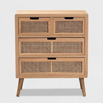 Cultivate a fresh, retro feel in your bedroom with the Alina chest. This sturdy wood chest showcases a medium oak finish for a look that’s both warm and inviting. Four drawers provide ample space for clothes, undergarments, and more. Woven rattan adds a cool, bohemian vibe, while angled legs and cut-out drawer handles lend mid-century charm. The Alina chest is made in China and requires assembly. Dimensions: 35.43″ high x 29.92″ wide x 13.78″ deep; Upper drawer: 5.91″ high x 13.39″ wide x 11.81″ deep; Lower drawer: 5.91″ high x 27.36″ wide x 11.81″ deep; Legs: 8.27″ high;