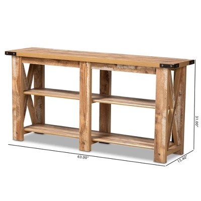 Add a bold centerpiece to your space with the stunning design of the Angelo console table. Made in Malaysia, the Angelo is comprised of sturdy wood showcasing a distressed oak brown finish for a weathered, antique look. Its broad tabletop and two spacious shelves provide ample surface area to organize busy rooms. Requiring assembly, the Angelo features robust crisscross side beams that stand out while allowing light to flow more easily throughout the room. Whether utilized in the entryway, hallway, or living room, the Angelo console table anchors any space with rustic charm. Overall Dimensions: 31″ High x 63″ Wide x 15.4″ Deep; Top Shelf: 10.1″ High x 54.5″ Wide x 11.5″ Deep; Bottom Shelf: 11.7″ High x 54.5″ Wide x 11.5″ Deep; Legs: 2″ High;