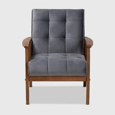 Declare your allegiance to timelessness with the Asta armchair. Constructed from solid rubberwood, the Asta showcases clean lines and a low profile. Soft, sumptuous gray velvet upholstery gives this armchair a distinctive look that pairs well with the walnut brown finish on the wood. Wide, plush cushions provide ample seating comfort, while biscuit tufting and angled legs lend a cool, retro feel. Stylish and versatile, this armchair is well suited for both private living spaces and public reception areas. The Asta armchair is made in Malaysia and requires assembly. Dimensions: 30.51″ High x 25.2″ Wide x 32.28″ Deep; Seating Dimensions: 20.28″ Wide x 20.87″ Deep x 16.34″ High (from Floor); Height (from Floor to Top of Arms): 20.87″ High; Back: 14.17″ High; Legs: 8.27″ High;