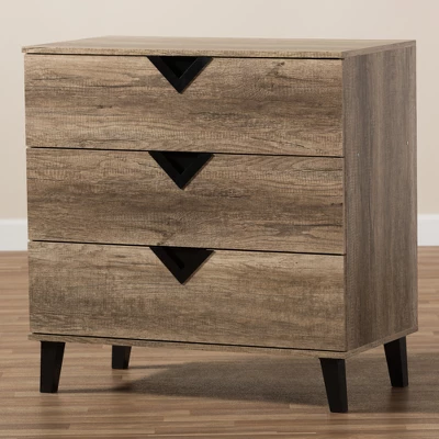 The Wales 3-drawer chest combines function and modern style. On a geometric silhouette, this oak effect veneered dresser features three drawers with triangle vinyl handles. Angled, legs support the Wales chest while contrasting with the oak veneered finishing. Constructed of engineered wood, the dresser is built to last. The Wales comes with three pull-out drawers on metal runners for a smooth movement for your clothes and linens. The under clearance area allows you to dust as often as you like to keep the area clean. Made in Malaysia, the Wales 3-drawer chest requires assembly. Dimensions: 35″ High x 35.04″ Wide x 18.9″ Deep; Drawers: 5.7″ High x 31.18″ Wide x 15.15″ Deep; Legs: 5.51″ High