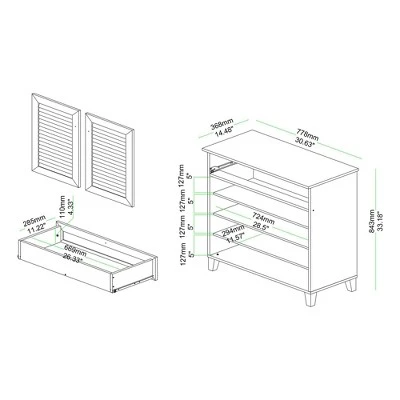 • Overall Dimensions: 33.20" High x 30.60" Wide x 14.50" Deep; Drawer Dimensions: 26.30" Wide x 11.20" Deep x 4.30" High; Shelf Dimensions: 28.50" Wide x 11.60" Deep x 5.00" High; Legs: 3.50" High;