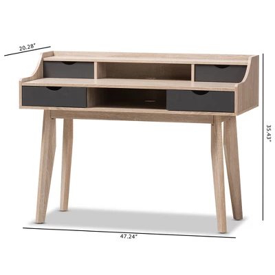 A perfect blend of classic and modernity, the Fella collection showcases pattern played with clever balance of colors and sleek surface. Constructed of engineered wood in oak and gray two-tone finishing, the Fella 4-drawer study desk reveals a fresh and relaxing look. Angled legs complements the piece of furniture for superior support and style. Four drawers open to reveal storage room for stationery and the two open shelves make room for books and magazines. Elevated rims allow the use of the top surface as display space for your décor. With practicality, the drawers with cut-out handles in gray wood finish contrast with the oak surface for a contemporary, Scandinavian aesthetic in your home. Made in Malaysia, the Fella 4-drawer study desk requires assembly.
