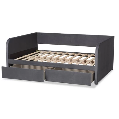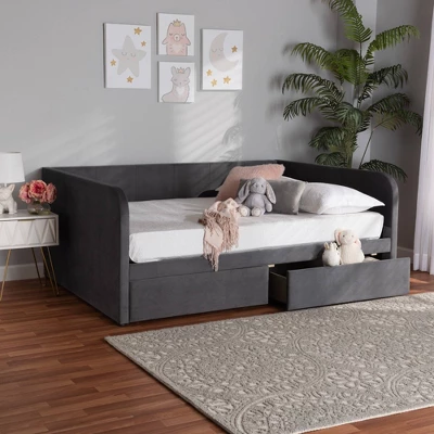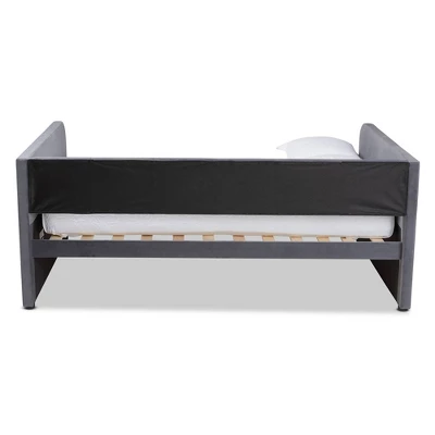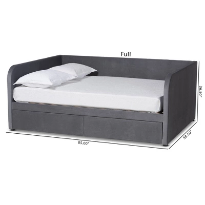 Endow your personal getaway with the fantastic versatility of the Basanti daybed. Made in Malaysia, this exquisite piece is comprised of a solid wood frame padded with foam and upholstered in lustrous velvet fabric. Two drawers provide a convenience storage area for sheets, clothes, and more. The Basanti requires assembly and utilizes wood slats for mattress support, eliminating the need for a box spring. The smooth curves of the arms create a sleek outline, making the Basanti daybed an easy and efficient addition to any bedroom space. Overall Bed Dimensions: 85.00″ W x 58.50″ D x 36.50″ H; Inside Dimensions/Mattress Size Fit: 76.00″ W x 54.70″ L; Storage: 37.50″ W x 31.30″ D x 10.50″ H; Arm Height from floor to top of Side Panel: 13.80″; Clearance/Bed Legs: 1.00″ H;