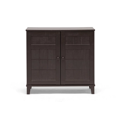 Combining modern and classic elements, our Glidden Designer Shoe Cabinet unobtrusively tucks away shoes yet keeps them close at hand for a quick walk with the dog or trip to the office. This contemporary shoe storage option is made of MDF and engineered wood with faux wood grain paper veneer: it’s so stylish you’d never guess shoes are inside. Four fixed-height horizontal shelves behind the cabinet doors are ideal for adult and children’s shoes alike, though boots are not recommended. Malaysian-made, this designer shoe cabinet requires assembly and should be wiped clean with a dry cloth. For those with more storage needs, a taller version of the Glidden Shoe Cabinet is also available (sold separately). Overall Dimensions: 28 inches high x 29.1 inches wide x 15.1 inches deep Overall Dimensions: 28 inches high x 29.1 inches wide x 15.1 inches deep
