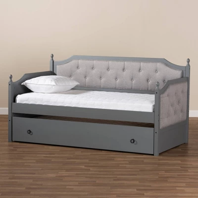 Naps and reading marathons abound with the cozy Mara daybed. This versatile piece is fitted with a pull-out trundle to provide convenient accommodation for overnight guests. Its sturdy wood construction ensures durability, while its classic gray finish makes it easy to coordinate with any existing color palette. Crafted with the utmost attention to detail, the Mara features elegant cut-out panels that are upholstered in a soft fabric and button tufted for a chic, refined look. Classic finial posts and black metal ring pulls complete the look. The Mara daybed is made in Malaysia and requires assembly.