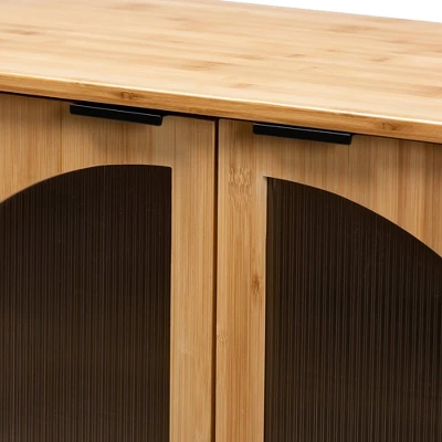 Express a style of casual elegance in your space with the carefree flair of the Naresh storage cabinet. Made in China, this stunning piece exudes mid-century charm with a bamboo frame embellished with crescent windows. The doors open to reveal two spacious shelves to organize household essentials while the tabletop serves as a fantastic display area for decorations. The Naresh requires assembly and features minimalist door handles to draw attention to the natural grain of the wood. Clean lines and rounded legs produce a delightful silhouette, making the Naresh storage cabinet a chic accent in any layout. Overall Dimensions: 31.50″ W x 15.70″ D x 31.50″ H; Shelf Space Behind Door (Each): 28.70″ W x 14.20″ D x 26.00″ H; Clearance: 3.90″ H;