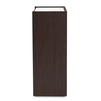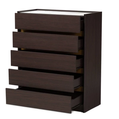 The sleek, modern flair of the Walker chest organizes your space in stunning style. Made in Malaysia, the Walker radiates rich wood tones with its dark brown finished frame. Five spacious drawers, outlined in a striking gold-tone finish, help maintain busy rooms with ample storage space for clothes, linens, and more. Requiring assembly, the Walker features a faux marble top for a luxurious accent steeped in modern glamour. With its radiant design and flexible convenience, the Walker chest is a superb addition to any space. Dimensions: 39.4″ High x 31.5″ Wide x 15.75″ Deep; Drawer Dimensions: 2.9″ High x 28.1″ Wide x 12.25″ Deep;