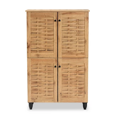 Keep your shoes organized and out of sight with the Winda shoe cabinet. Made in Malaysia, this cabinet is crafted from sturdy wood featuring a natural oak brown finish that easily coordinates with a wide range of interior designs. Four doors conceal six shelves with storage space for up to 18 pairs of shoes, depending on size. Requiring assembly, the Winda feature slits on the doors to enable air circulation and reduce odor buildup. A modern solution to entryway storage, the Winda shoe cabinet allows busy homes to feel more open and organized. Dimensions: 48.2″ High x 30″ Wide x 13.10″ Deep; Storage (Shelves) Dimensions: 6.8″ High x 28.03″ Wide x 11.50″ Deep; Legs: 3.74″ High;